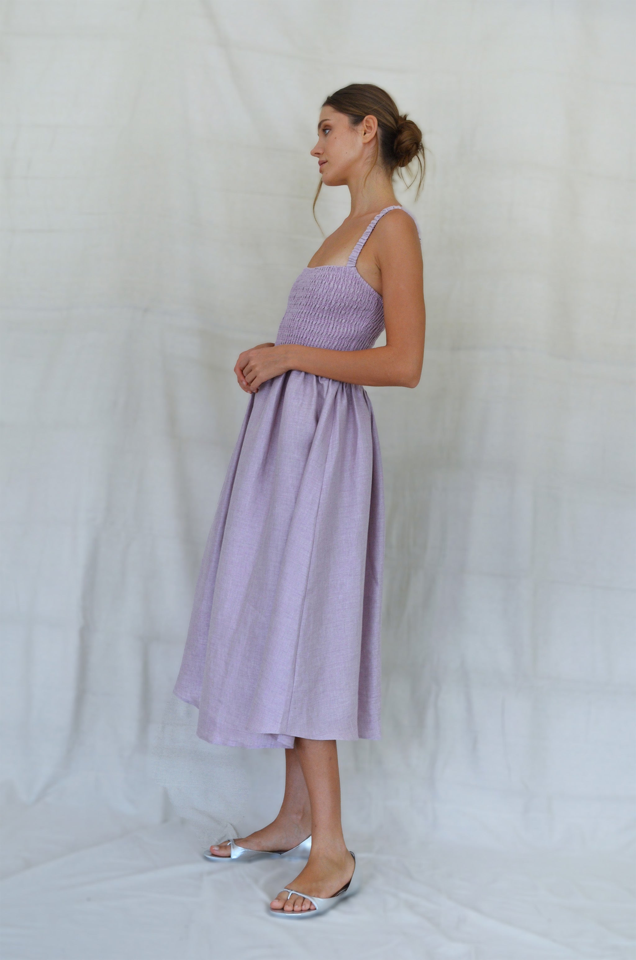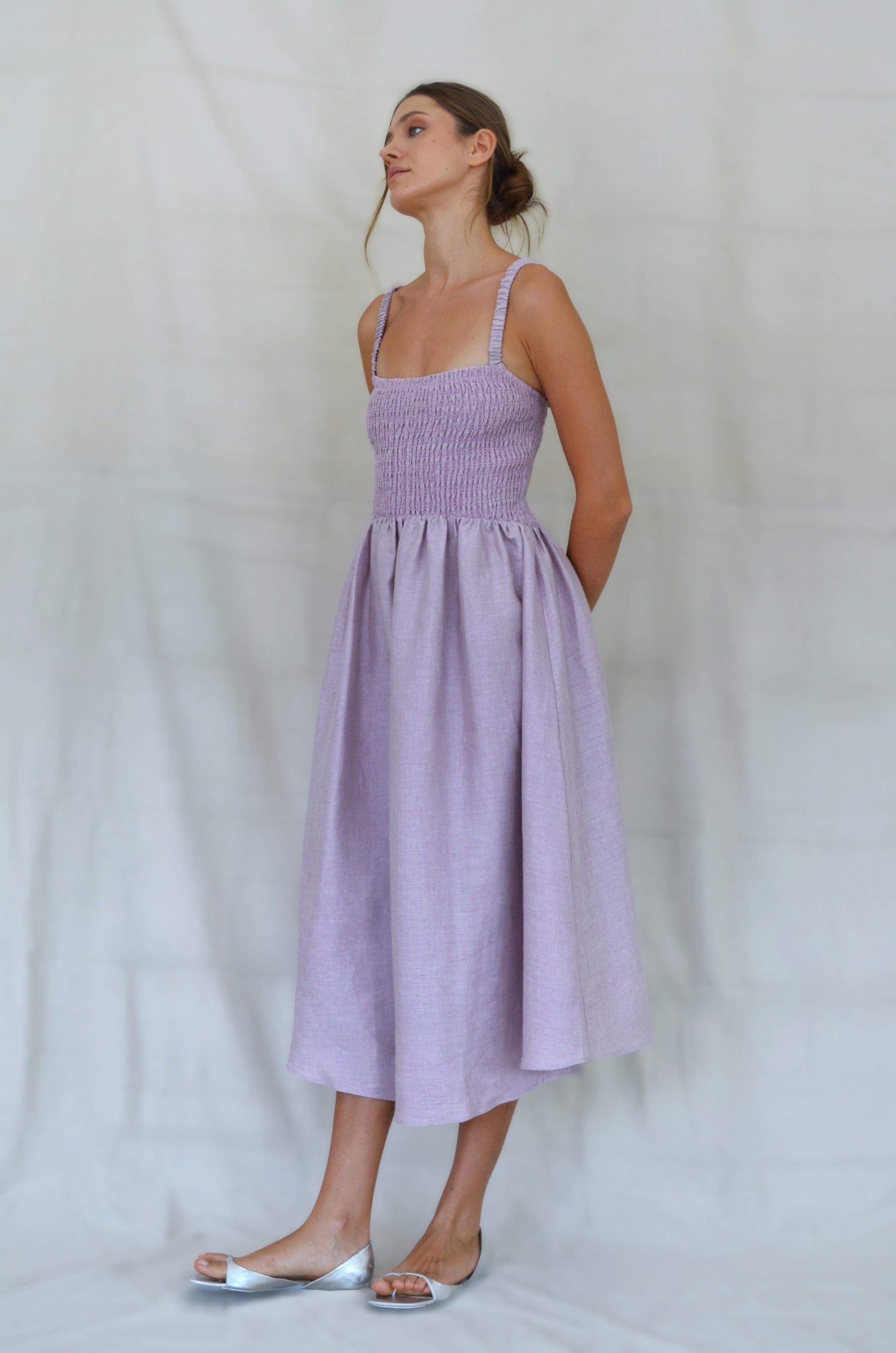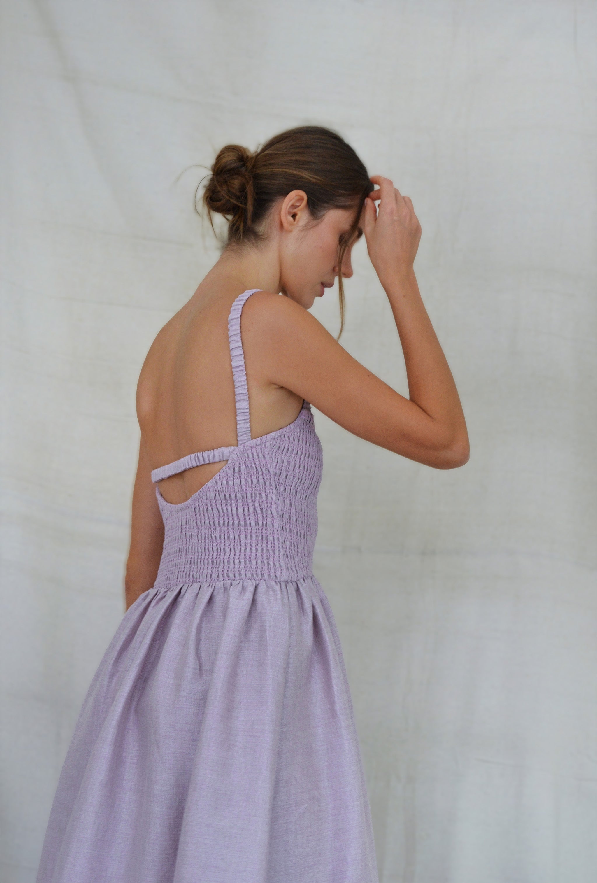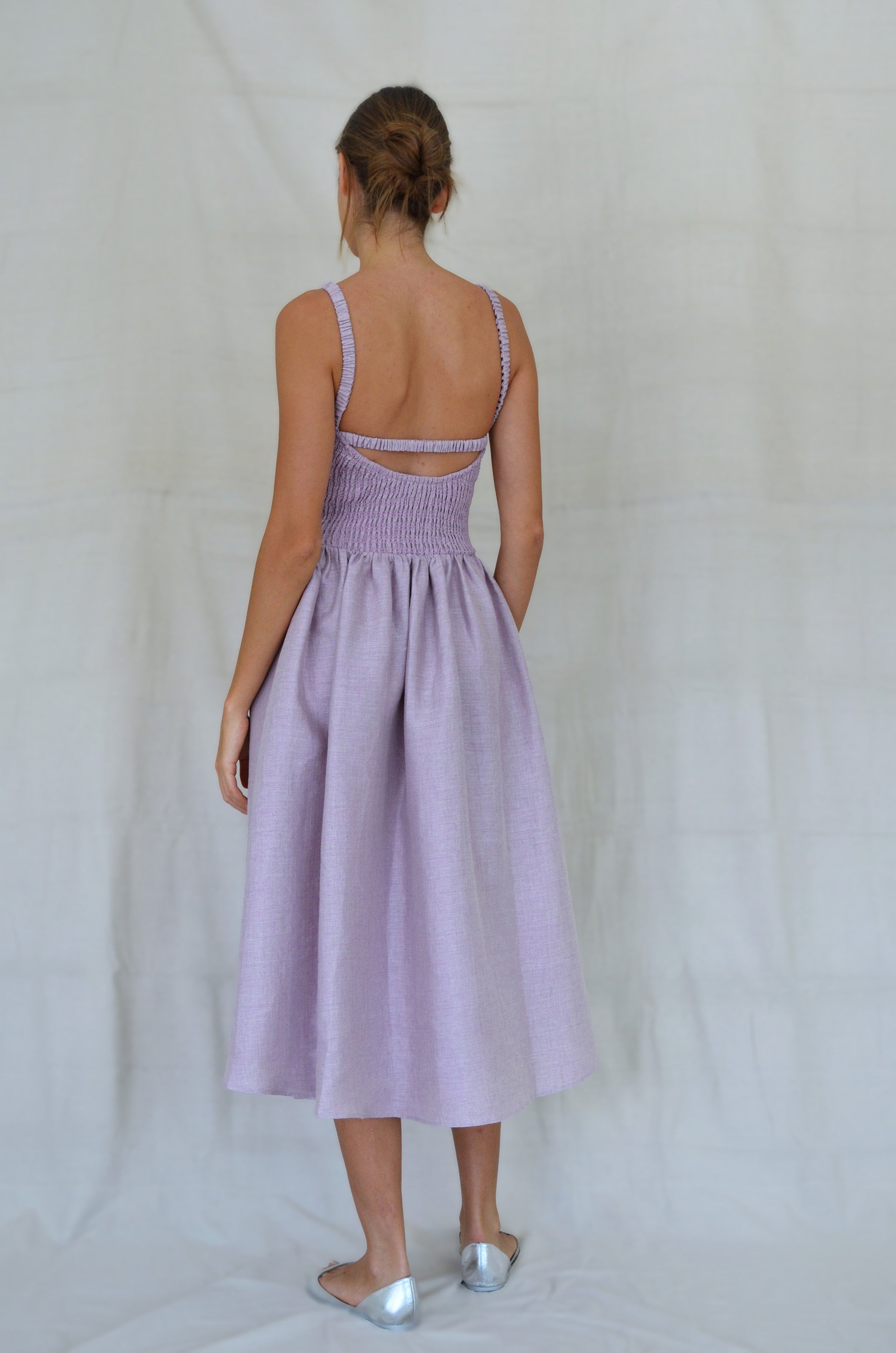 A classic ballerina bodice with a low-cut, square neckline and full midi skirt. Shirred top and slightly curved at the waist. Ruched flat lay straps and open back.