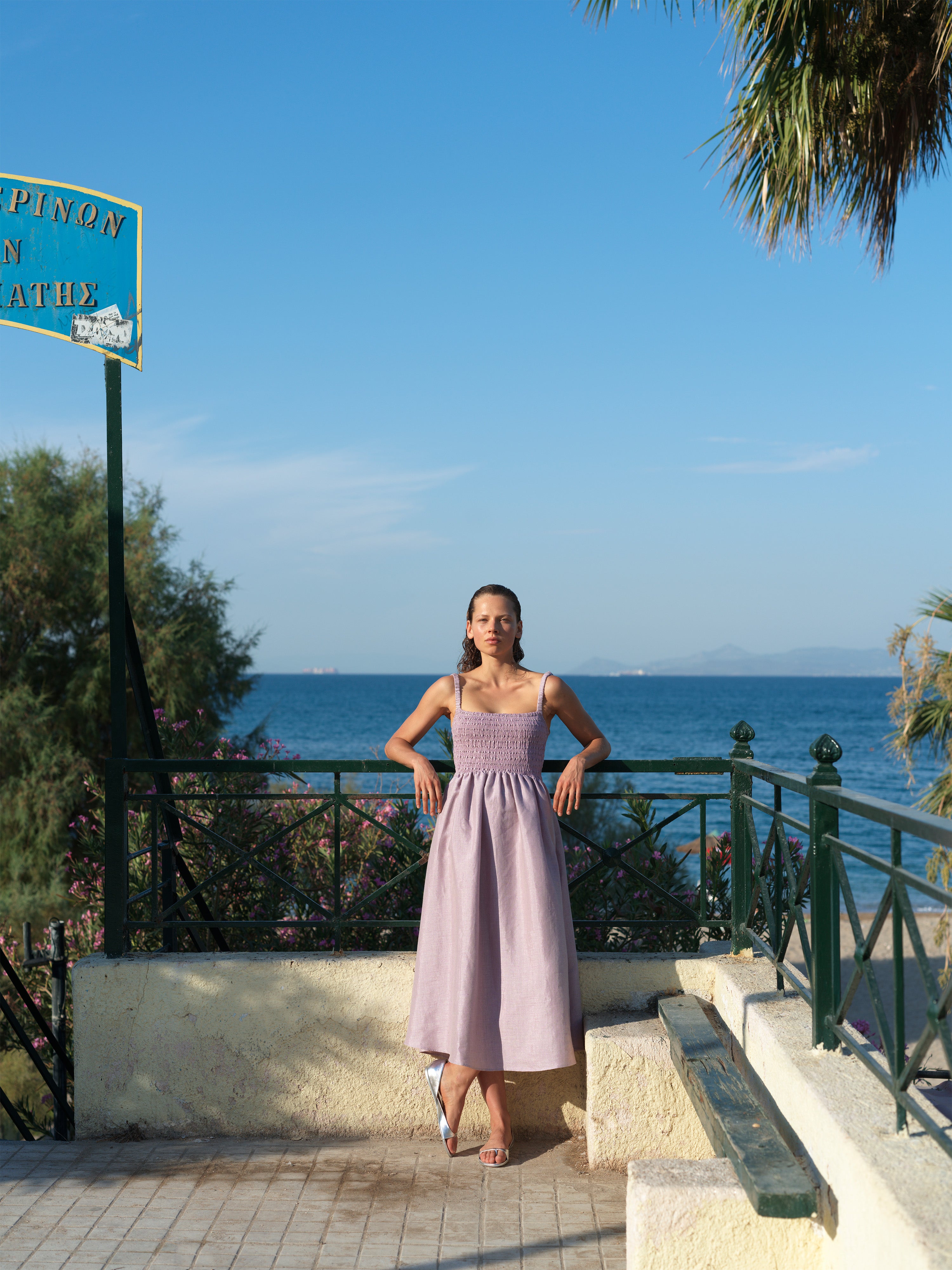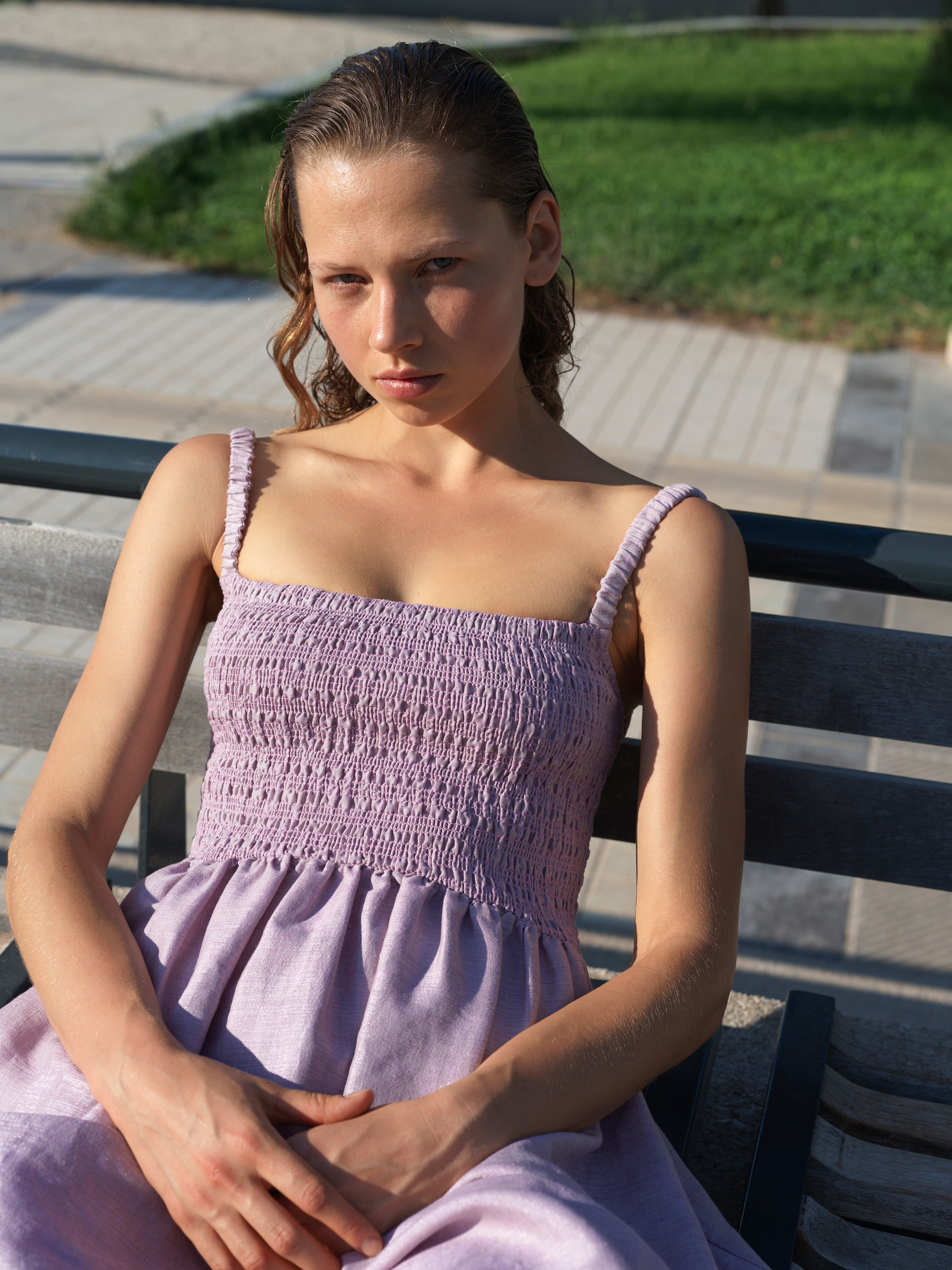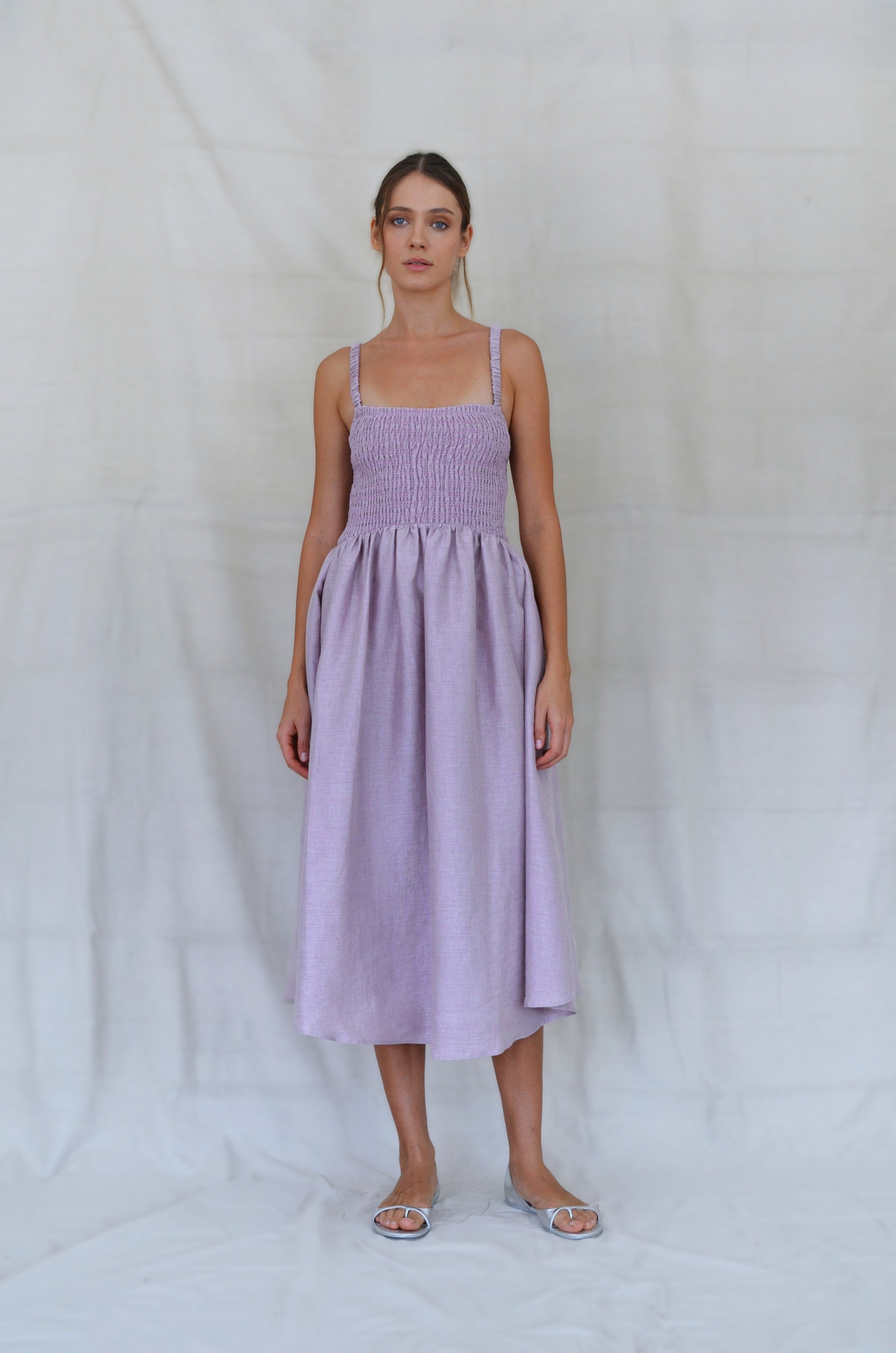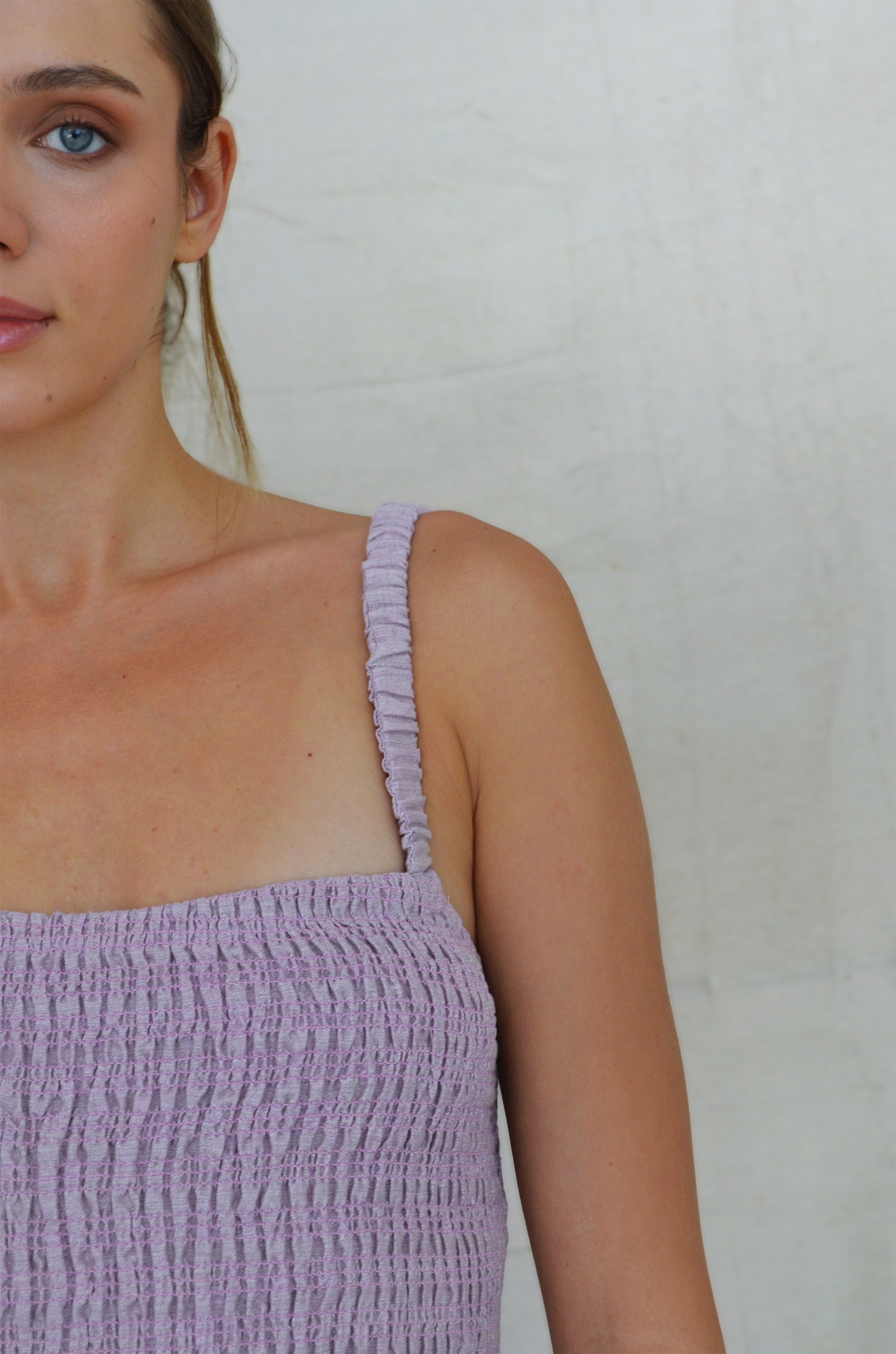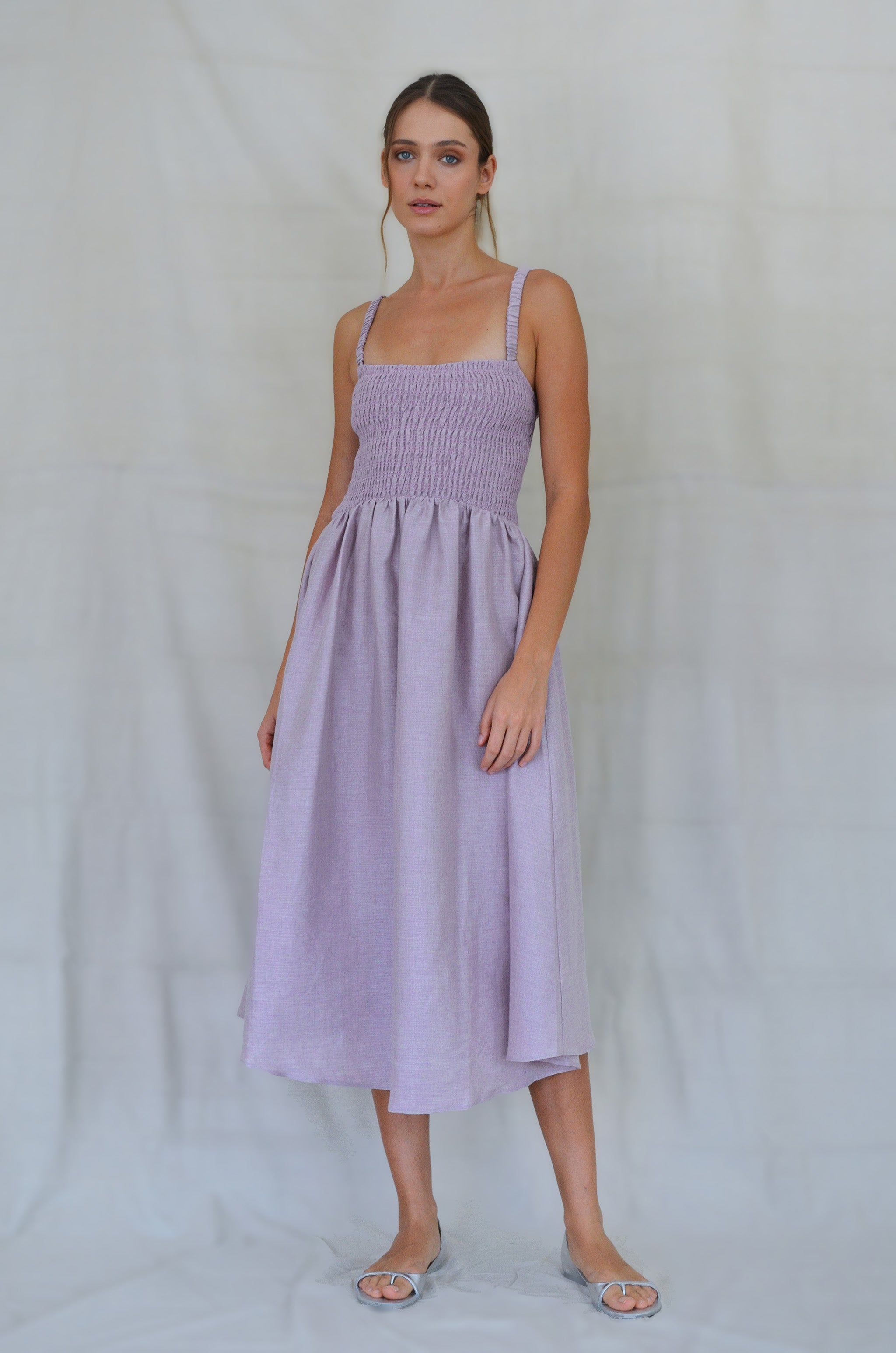 A classic ballerina bodice with a low-cut, square neckline and full midi skirt. Shirred top and slightly curved at the waist. Ruched flat lay straps and open back.