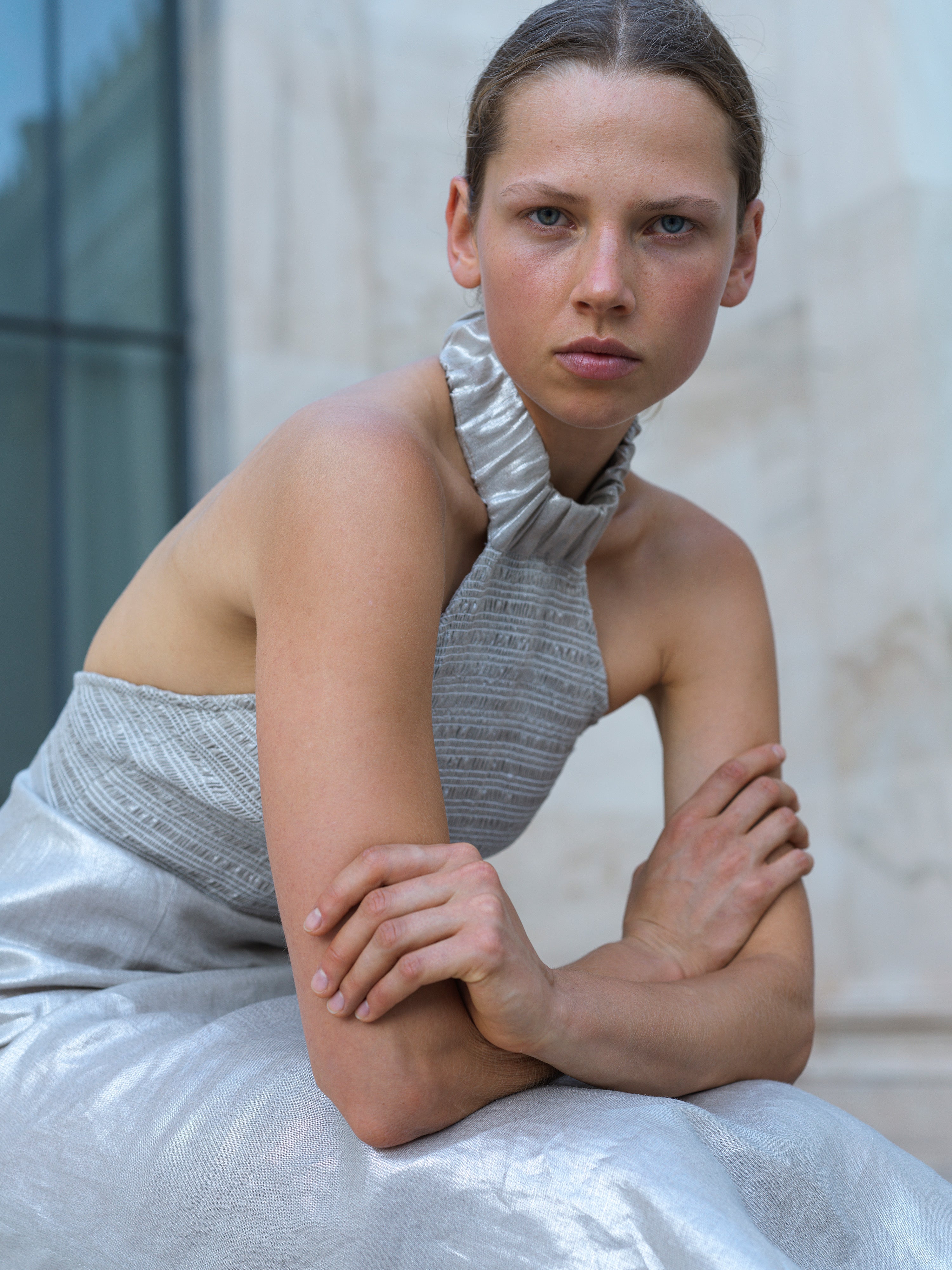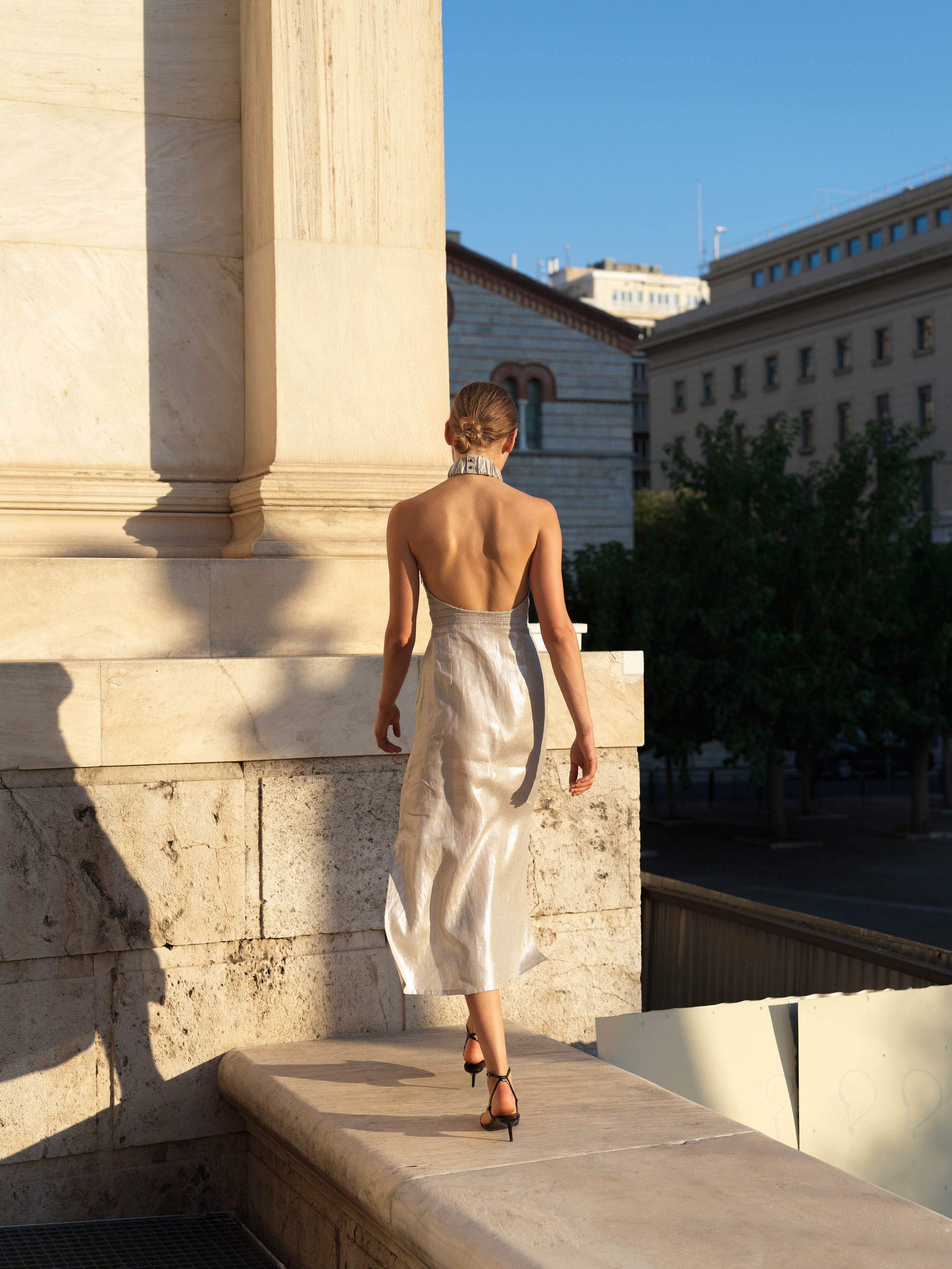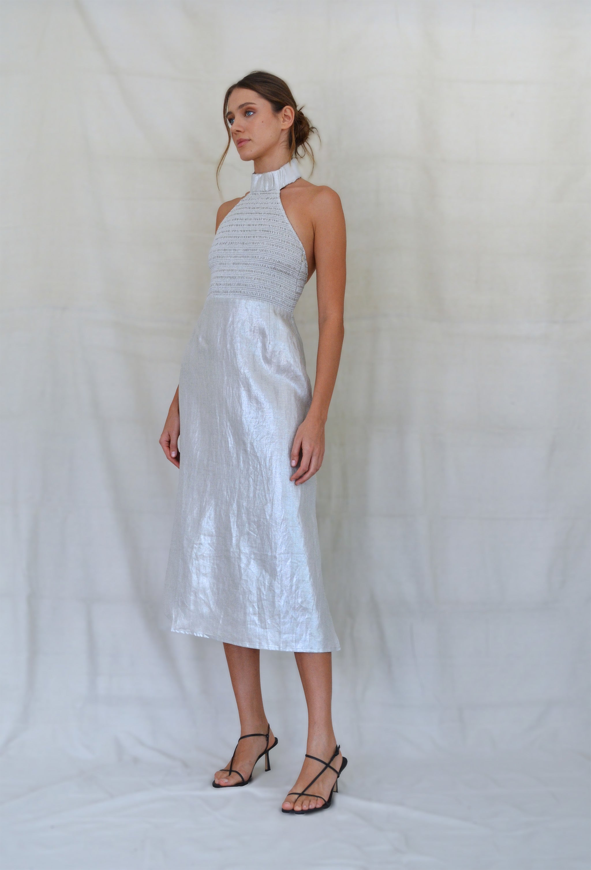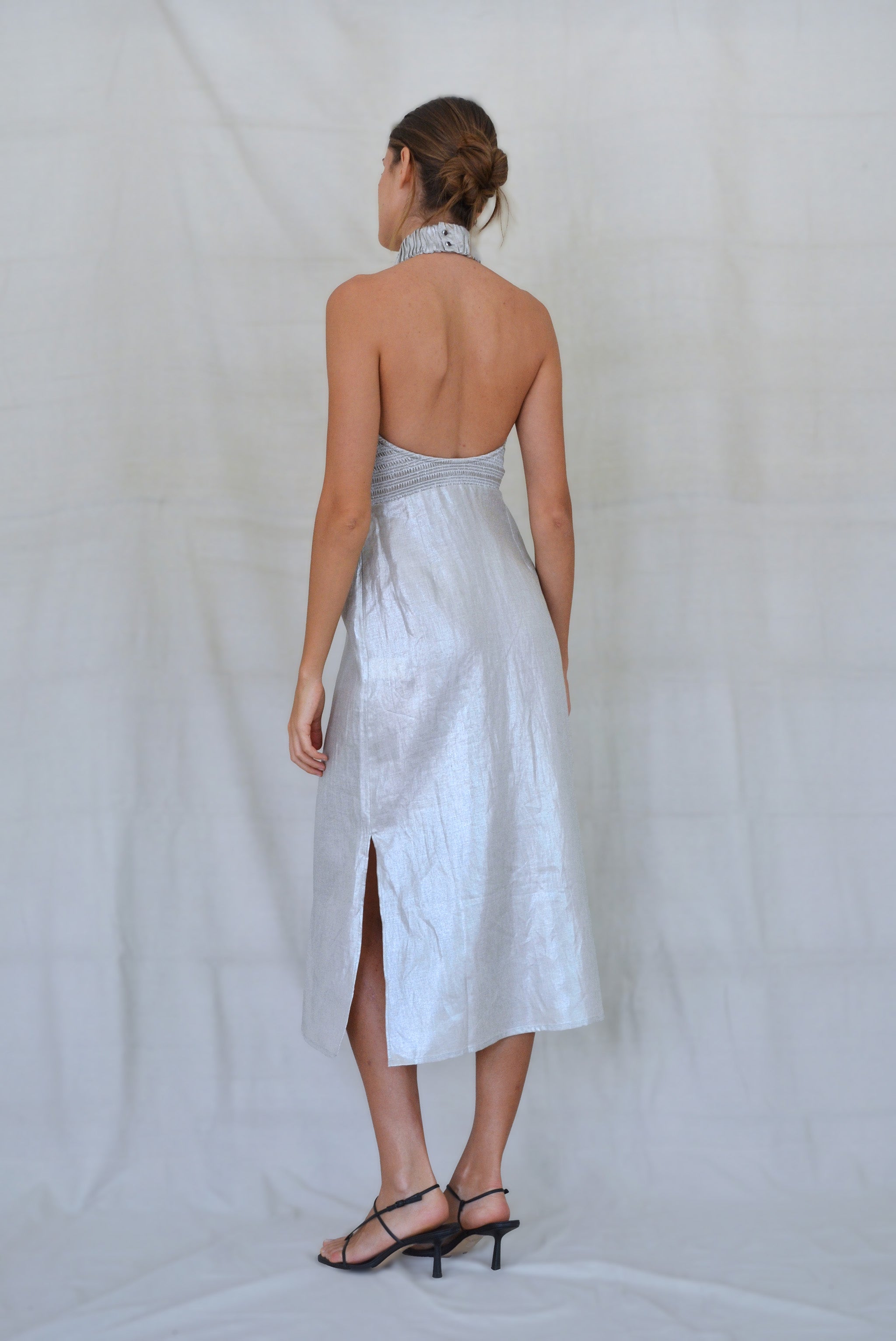 Inspired by French cinema; at once dramatic and effortless. High statement neck fastened with enamel buttons. Shirred bodice with plunging open back. Straight skirt with side slits.